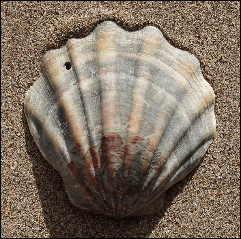 | Valve isolée (vue externe) avec une perforation manifestement artificielle. Il y aurait d'autres Pectens dans les réserves du Musée selon Mme Izac et Mr.Tissot) | Voir aussi Fig.42a