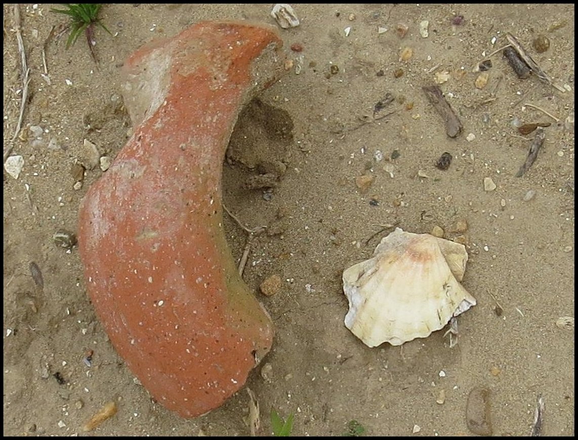 | Mur émergeant et dépotoir (D) dans talus à gauche, Pectens (détail) à droite | Pectens, tessons |